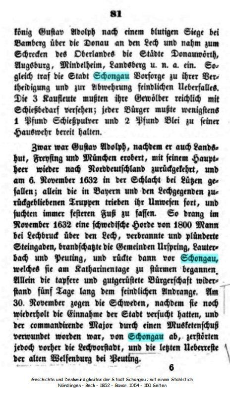 Während des 30- jährigen Krieges im Jahr 1632 verteidigten die Schongauer Schützen die Stadt erfolgreich über 5 Tage gegen ein Heer von 1800 Schweden.