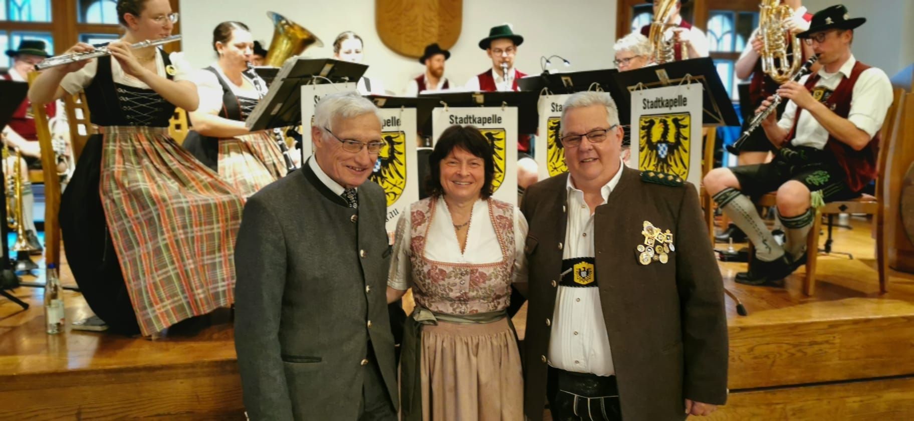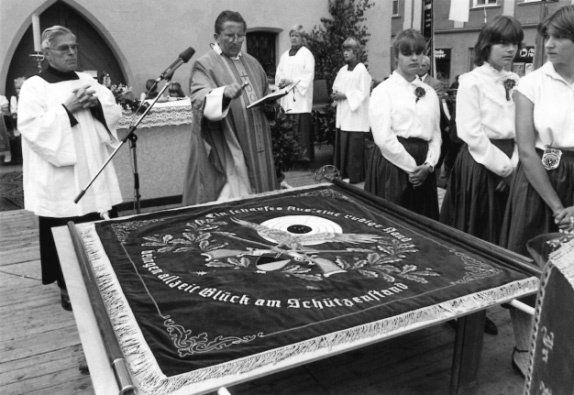 - Juni 1980, 450 Jahrfeier, Ehrengäste: Ihre Königliche Hoheit Marie-Charlotte Fürstin von Quadt mit Ehegatten seine Durchlaucht Paul Fürst von Quadt in der Mitte neben Bürgermeister Handl und 1. Schützenmeister Baumgärtner und etwas links der Gauschützenmeister Sporer.