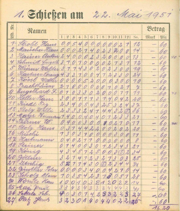 Ab Mai 1951 schießen die Schützen in der unbenutzten Kegelbahn des Gasthofs Köhler (Sonne) mit Luftdruckwaffen und Zimmerstutzen wieder auf 6 Schießständen, jetzt sind bereits 52 Schützen im Verein.