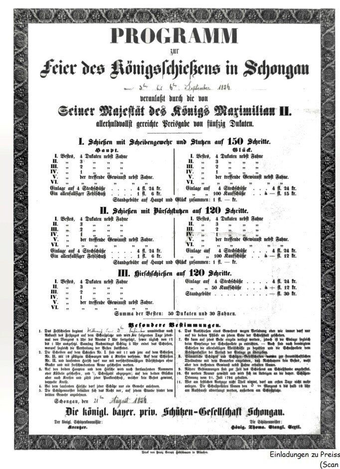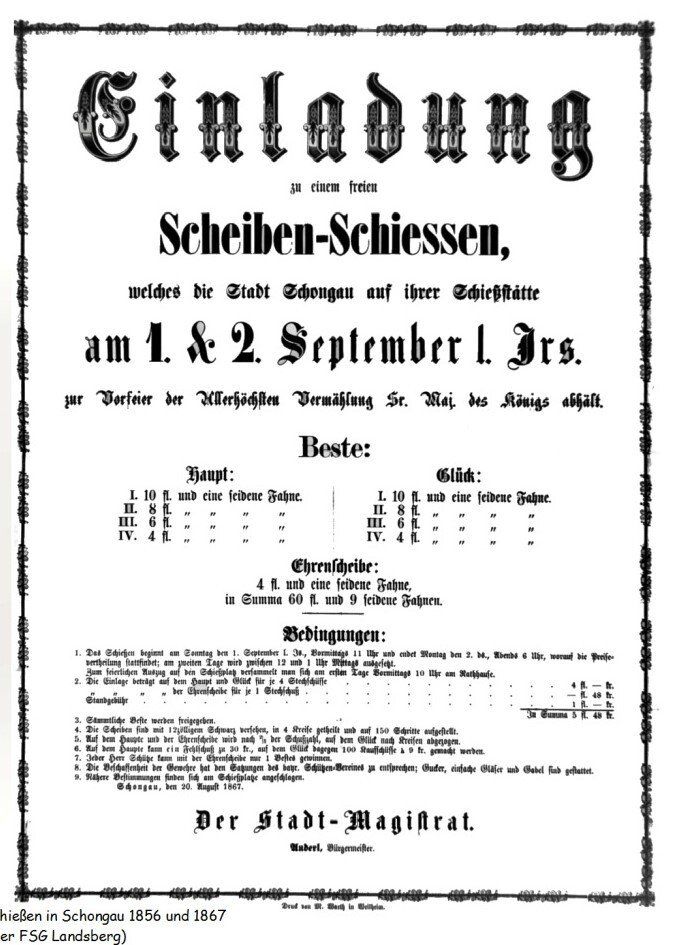 1651, nach dem 30- jährigen Krieg und seinen Zerstörungen wurde die Schützengesellschaft Schongau erneuert. Dies ist auch die älteste noch bekannte Schützenordnung.