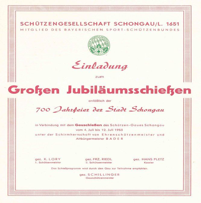1953, 4. Juni bis 12. Juni, Jubiläumsschiessen und Gauschiessen in Schongau mit 435 Schützen. Am 5.7 war der große Festzug, das größte Ereignis in Schongau seit Kriegsende